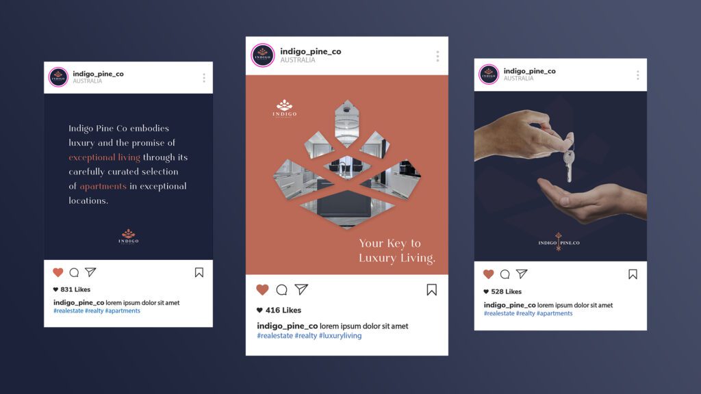 The overall brand identity is characterized by clean, minimalistic approach and a perfect balance between the natural and man-made elements. We wanted it to radiate elegance and reflect the premium offerings of Indigo Pine Co in the real estate market.