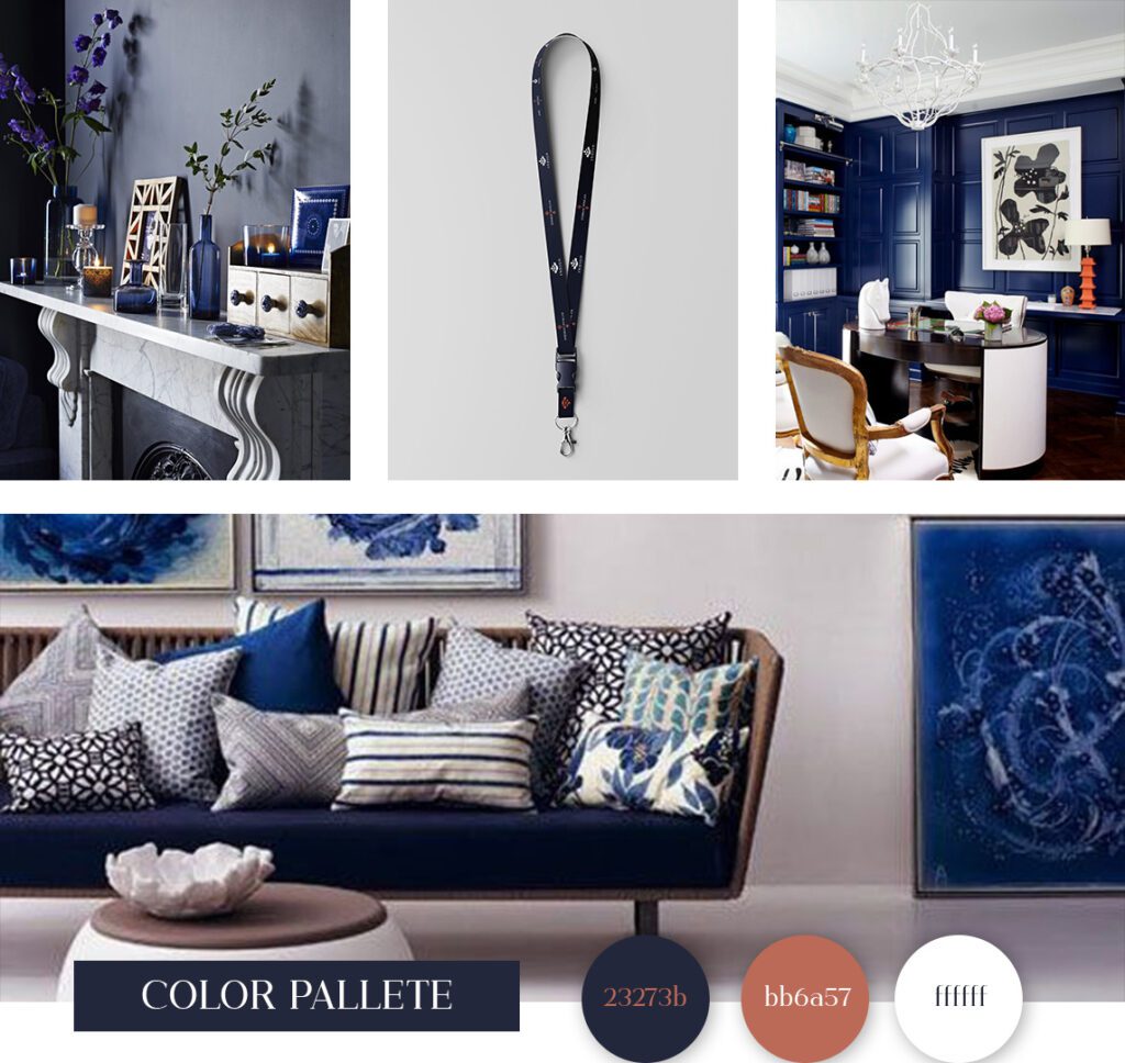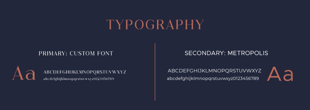 It uses high-end serif font types that exceptionally exude sophistication and complement the overall minimalist design. The color palette is carefully chosen to evoke a sense of luxury, professionalism, and prestige. The primary color is a rich Indigo Blue, symbolizing trust, stability, and integrity. The secondary color is bronze, adding a touch of warmth, luxury and timelessness to the design.