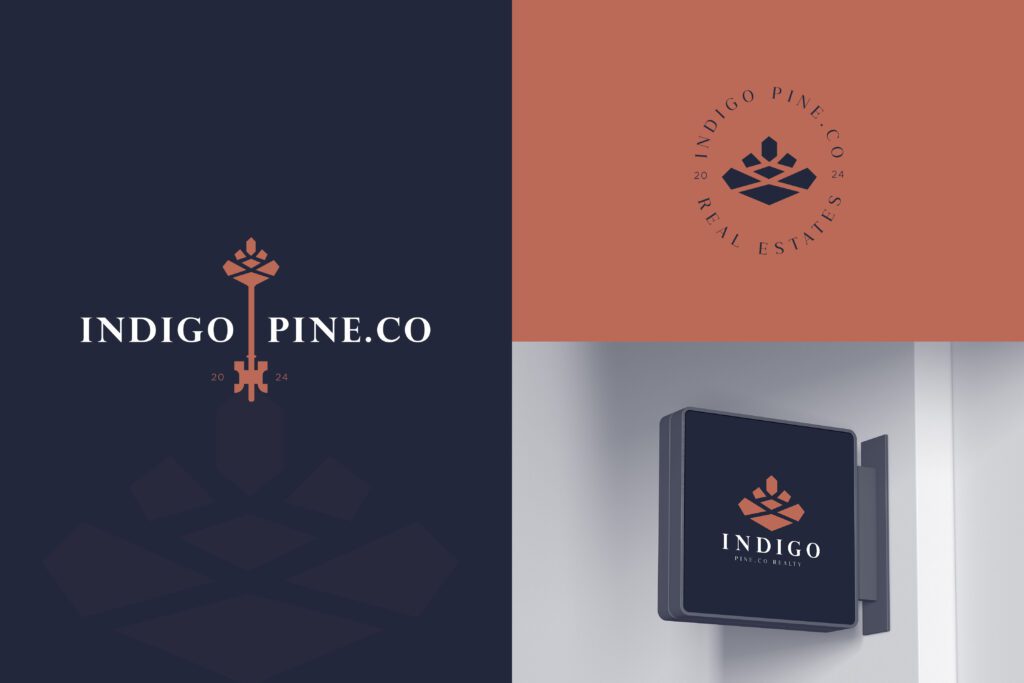 We came up with a sophisticated key creatively crafted by combining the top part of a pine cone with the bottom part of a classic key, creating a harmonious fusion of nature and real estate as the brandmark. The design is a premium horizontal lockup with the text “Indigo” elegantly placed on the left side of the key and “Pine Co” on the right side.
