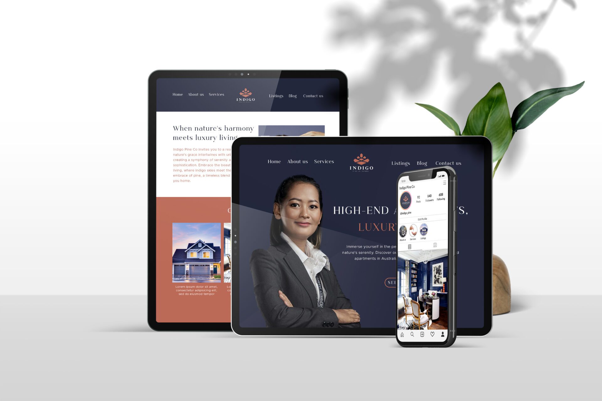 The overall brand identity is characterized by clean, minimalistic approach and a perfect balance between the natural and man-made elements. We wanted it to radiate elegance and reflect the premium offerings of Indigo Pine Co in the real estate market.